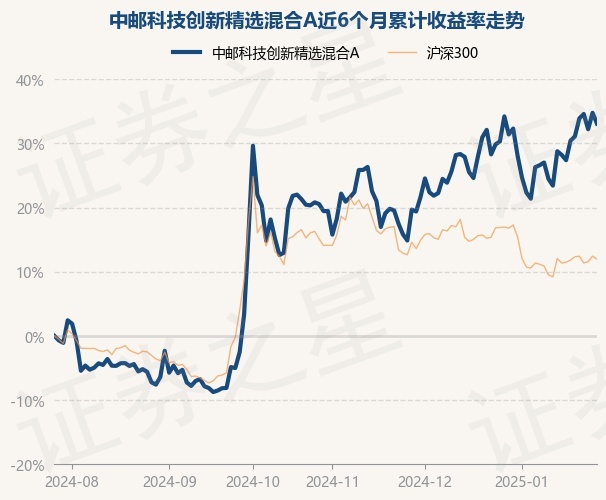 本站消息,1月27日,中邮科技创新精选混合A最新单位净值为1.5471元,累计净值为1.864元,较前一交易日下跌1.24%。历史数据显示该基金近1个月上涨1.28%,近3个月上涨10.59%,近6个月上涨33.1%,近1年上涨45.46%。该基金近6个月的累计收益率走势如下图: